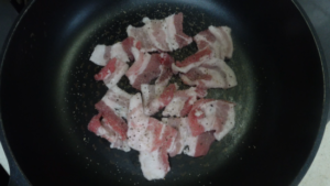 ①フライパンに豚バラを並べて塩・こしょうをふります。