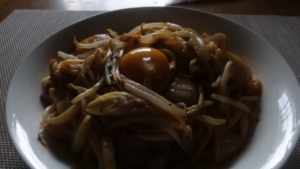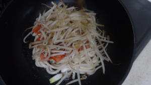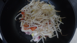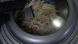 さらにもやしを重ねてフタをして中火で蒸し焼きします。