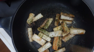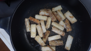 ※長芋を触り過ぎず、表面がキツネ色になるまで焼きましょう。