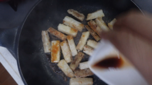 ④ カリッと焼けたら火を止め、醤油を全体にからめます。