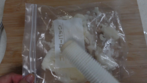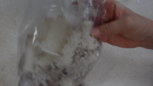 ② カットした長芋をポリ袋に入れ、塩と小麦粉を加え、中に空気を含ませ、シャカシャカ振って塩と粉を全体にまぶします。