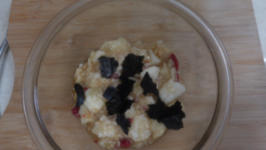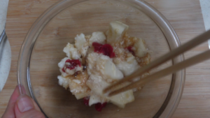 ②ボウルに長芋と梅干し2個を手でちぎり入れ、しょう油小さじ2をかけて混ぜます。