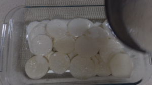 ②3mm幅に切った長芋を耐熱皿に敷き詰め、ソースを回しかけます。