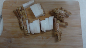 ① 長芋をきれいに洗い、皮つきのまま1.5センチ角、長さ4〜5センチにカットします。