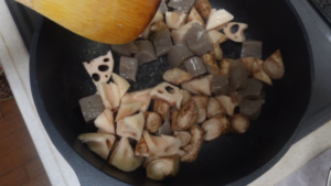 ③別の鍋に植物油(大2)、れんこん、ごぼう、こんにゃくを入れて軽く炒めます。
