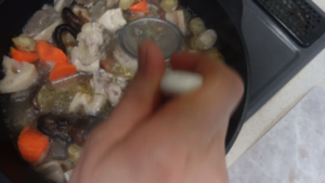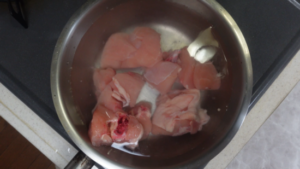 ①鍋に骨付き鶏のスープの骨付き鶏ぶつ切り(鍋用 350~400g)・酒(1カップ)・水(3カップ)を入れて火にかけます。