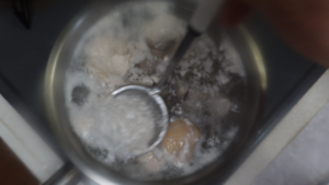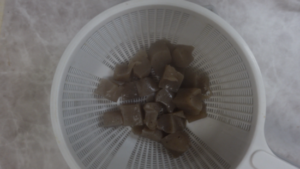 こんにゃく(170g)はスプーンでひと口大にちぎり、湯通しします。