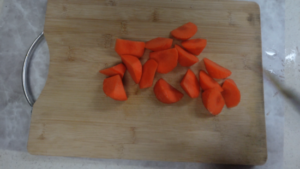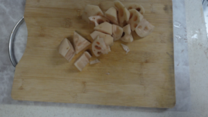 ②れんこん(170g)、にんじん(170g)、ごぼう(120g)は乱切りにします。