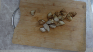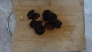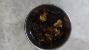 干ししいたけ(8枚)は水に3時間以上浸して戻し、軸を除きます。