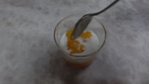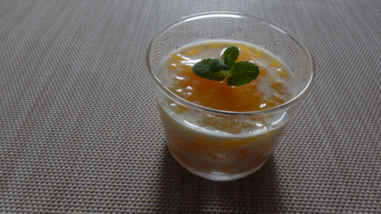 グラスに取り分けて冷えた牛乳を注ぐとオレンジの酸味で牛乳がとろっとしてとても美味しいさわやかなデザートです。
