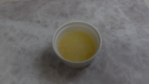 ②小さな耐熱容器にゼラチンを入れ水大さじ5を加えて混ぜたら、しばらくおいてふやかします。ラップをしないで電子レンジに約30秒加熱して溶かします。