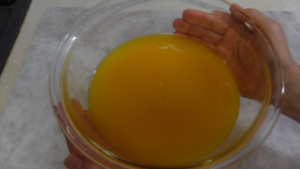 ①オレンジジュースは冷蔵庫から早めに出して常温にしておきます。