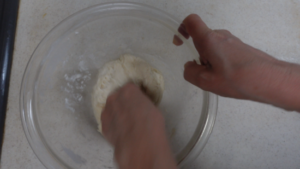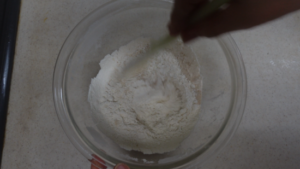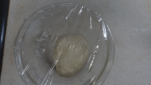 ③ひとまとまりになったら、ラップをかぶせ、10分間ほどおいて生地を休ませます。