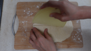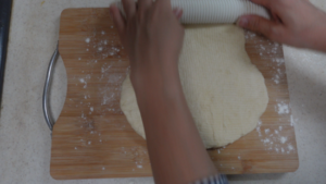 ④台に打ち粉(強力粉/分量外)をふり、生地を麺棒で厚さ1cm、直径20cmくらいにのばします。