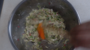 ④焼く直前に卵1コを加えてざっくりと混ぜます。