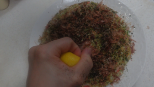 ⑦器に盛り、青のり粉と削り節をふりレモン汁を搾ります。