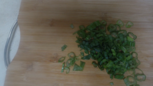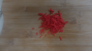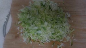 ①キャベツ、ちくわ、紅しょうがは粗みじん切りにし、青ねぎは小口切りにします。