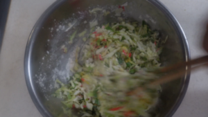 ③ボウルに山芋、キャベツ、青ねぎ、ちくわ、紅しょうが、小麦粉、卵を入れ混ぜ合わせます。