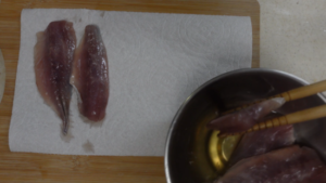 ボウルに酢を入れてあじを洗い塩をとります。