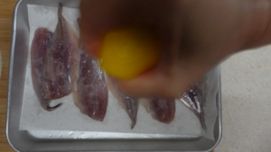 レモン1/2個を絞りかけ冷蔵庫で20~30分おきます。