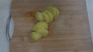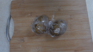 ②じゃがいもは皮付きのまま丸ごとラップで包み、電子レンジで柔らかくします。600wで5~6分が目安。途中で上下返します。