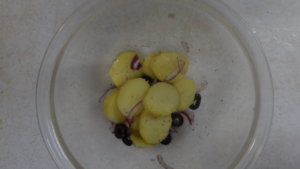 ③ボウルにじゃがいも、赤玉ねぎ、輪切りにオリーブ、レモン汁1/2個分mオリーブ油を入れて塩・こしょうをしてざっくりと混ぜます。