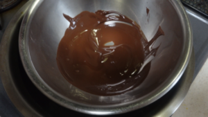 ①ボウルにチョコレートを細かく割り、湯せんで溶かします。