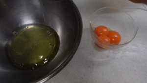 ①卵は卵黄と卵白に分けます。
