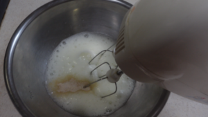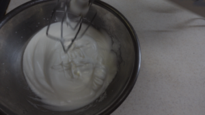 砂糖を数回に分けて加え、都度泡立てて、きめ細やかなメレンゲを作ります。電動ハンドミキサーを使いました。最後は低速でしばらく混ぜると、きめが整います。