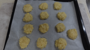 ③スプーンですくい、クッキングシートを敷いた天板に落とします。丸く形をととのえます。