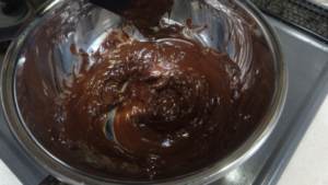 ① チョコレートとバターを湯せんし、火からおろしてなめらかになるまで混ぜます。