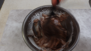 ③ チョコレートの粗熱がとれたら、生クリームに混ぜ合わせます。