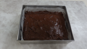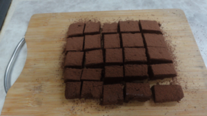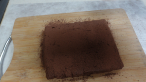 ⑤④をスプーンですくって手早くボール状に丸めます。ボール状ではなく包丁でカットしました。ココアパウダーをふったバットに入れ、溶けないように手早くまぶしますが、今回はボール状ではないのでカットの前にココアパウダーをふりました。