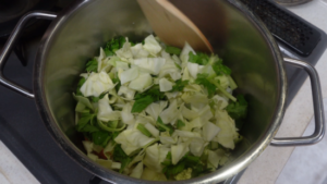 ①野菜はすべて1.5cm角(または1.5cm四方)に切ります。鍋にオリーブ油大さじ1を弱火で熱し、野菜、塩1つまみを入れ、じっくりと炒めます。