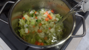 ②野菜がしんなりとしたら、かぶるくらいまで水を注いで強火にします。
