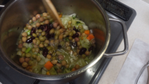 ミックスビーンズ、スープの素を加えて約10分間煮ます。