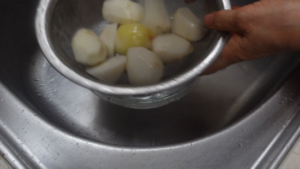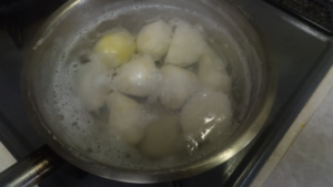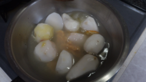 鍋に里芋を入れ、たっぷりの水を加えて火にかけて5~6分下茹でします。