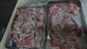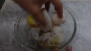 1. 豚肉に小麦粉をまぶし、ショウガはすりおろします。