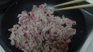 2. フライパンに油を熱し、豚肉を中火で焼きます。