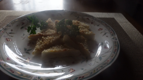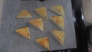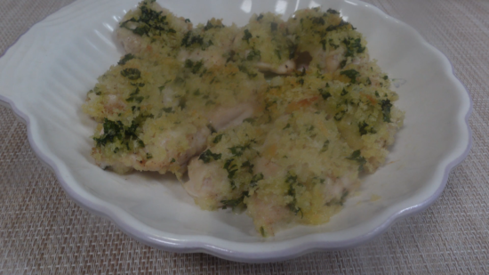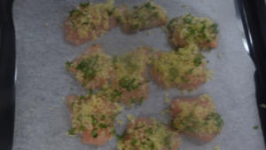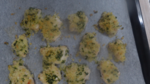 ③オーブンシートをしいた天板に鶏ささみを並べてパン粉・おろしにんにく・パセリを入れて混ぜあわせたものをのせ、オーブン(230℃)で10分ほど焼きます。