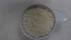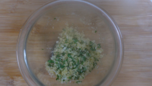 ②ボウルにパン粉・おろしにんにく・パセリを入れて混ぜ、オリーブオイルを加えてさらに混ぜ合わせます。