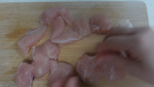 ①鶏ささみの筋をとって3等分に切り、塩・こしょうをまぶし手で押し広げます。