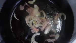 ①フライパンに油をひき、玉ねぎとベーコンをしんなりするまで炒め、軽く塩・こしょうをします。