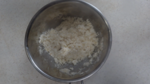 ②ボウルにパン粉と牛乳を入れて混ぜ合わせます。