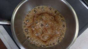 ① 小鍋に砂糖を入れ、水小さじ2を砂糖全体がしっとりするように入れて中火にかけます。泡が小さくなってこげ茶色になったら火から外します。
