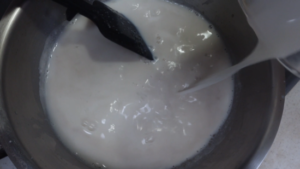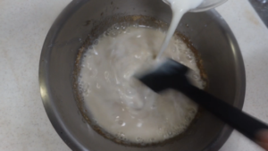 火に戻して残りの牛乳を加えて、鍋底からよく混ぜながら加熱します。