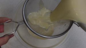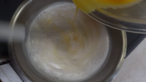 ②ボウルに全卵と卵黄を入れて混ぜ ①を熱いうち少しずつ加えてよく混ぜます。