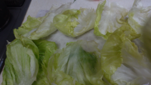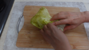 ④レタスの葉を剥がし 大きい葉と小さい葉を組み合わせて8等分にし 葉を広げ、たねを包みます。
