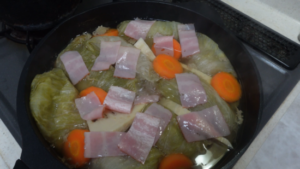 最後にベーコンを3cm 幅に切って加え さっと火を通します。味を見て足りなければ 塩 好みで 胡椒を加えます。