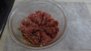 ③ボールに野菜 合挽き肉 卵 パン粉 牛乳を入れて 塩コショウをしよくこねて 8等分にしてまるめます。